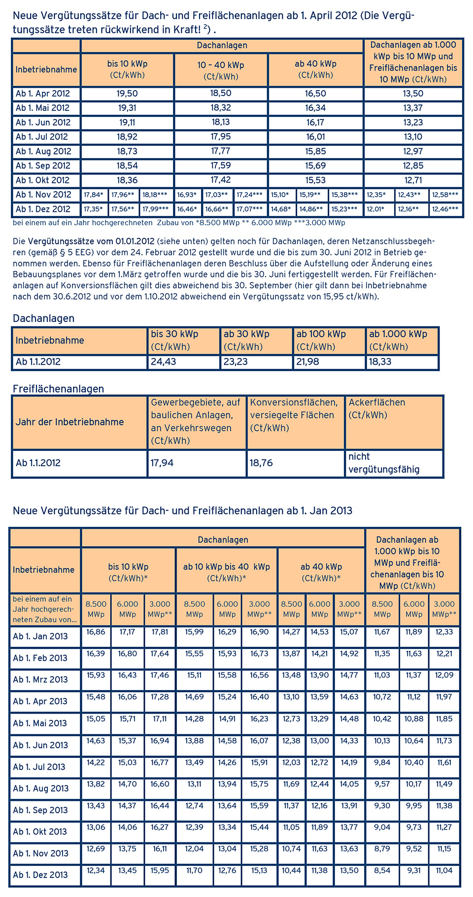 ** 1 Prozent Basisdegression pro Monat Anmerkung: Für die Berechnung der Vergütung einzelner Anlagen gilt auch weiterhin, dass die einzelnen aufgeführten Vergütungssätze anteilig für den jeweiligen Leistungswert der Anlage bemessen werden (Mischkalkulation der jeweiligen Vergütungsklassen nach Anlagenleistung). Die Anlagenkategorie des Marktintegrationsmodells (10-1.000 kWp) stellt eine scharfe Grenze dar (keine Mischkalkulation). D.h. für eine 11 kWp bzw. 999 kWp Anlage gilt das Modell und für eine 9 kWp bzw. 1.001 kWp gilt es nicht.